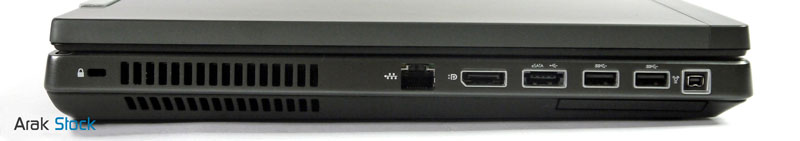 سمت چپ دستگاه: Kensington Lock, LAN, DisplayPort, eSATA/USB 2.0, 2 x USB 3.0, FireWire