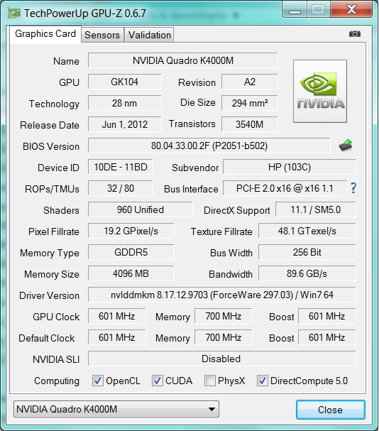 VGA: 2 GIG QuADRO K3000M