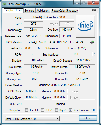 پردازنده lvy Bridge بودن، به معنای این است که پردازنده دو هسته ای i5-3320M بصورت یکپارچه دارای یک پردازنده گرافیکی intel HD 4000  است. این جانشین  Sandy Bridge Intel HD 3000 به طور گسترده ای در اینجا مورد آزمایش قرار گرفته است، اگرچه ما همچنان برای به روز رسانی بنچ مارک های بازی با داده بیشتر همانطور که این GPU به طور نسبی در این میان جدید است. در X230، اینتل یکپارچه به طور معمول در 350 مگاهرتز بیکار خواهد بود، اما توربو بوست به  GPU  به هر روشی ضربه و تکان وارد می کند  اگر اپلیکیشن نیاز داشته باشد، تا به 1200MHz  برسددر حالی که حافظه باس در مقایسه با آن یک مقدار 800MHz ثابت است.