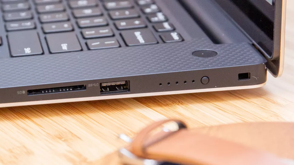در سمت چپ، جک پاور، یک پورت USB 3.1، یک درگاه HDMI 2.0، یک پورت Thunderbolt 3 و یک جک هدفون وجود دارد، در حالی که سمت راست دارای یک اسلات قفل، یک پورت USB 3.1 و یک اسلات کارت SD است.