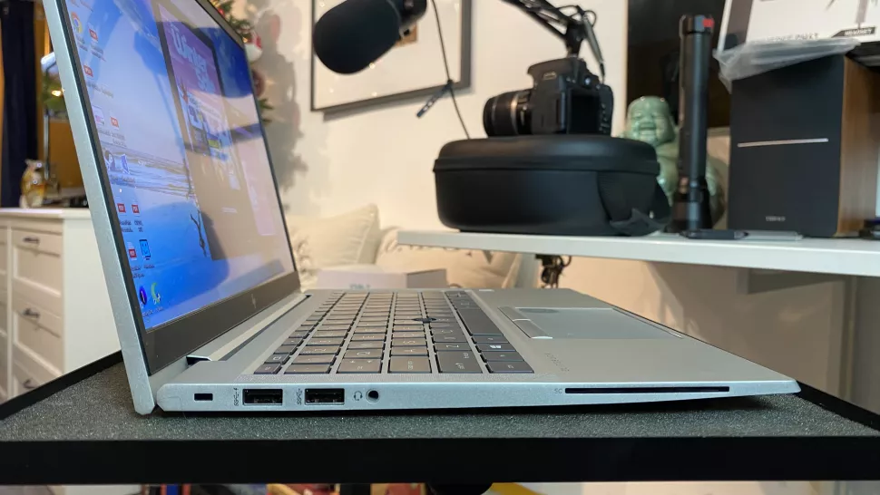 Elitebook 845 G7 با تمام درگاه‌های مناسب همراه است. در سمت راست، یک شکاف کارت NanoSim، دو درگاه USB Type-C ،HDMI و یک درگاه برق پیدا می‌کنیم. در سمت چپ خواننده SmartCard ، یک جک صوتی 3.5 میلی متر، دو درگاه USB Type-A و یک شکاف قفل قرار دارد.